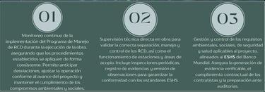 El BID requiere que las medidas ambientales no solo estén definidas, sino que funcionen y se mantengan durante la ejecución del proyecto. Este seguimiento permite al organismo ejecutor anticipar observaciones y mantener el proyecto alineado a los compromisos ambientales adquiridos con el BID.